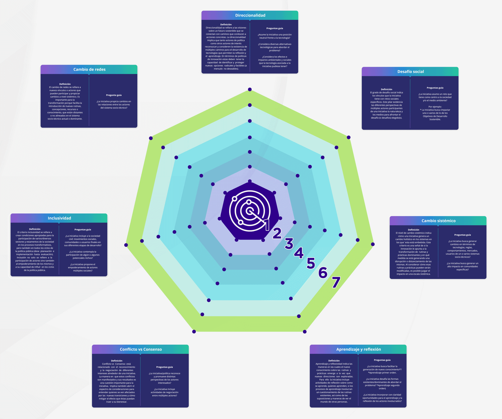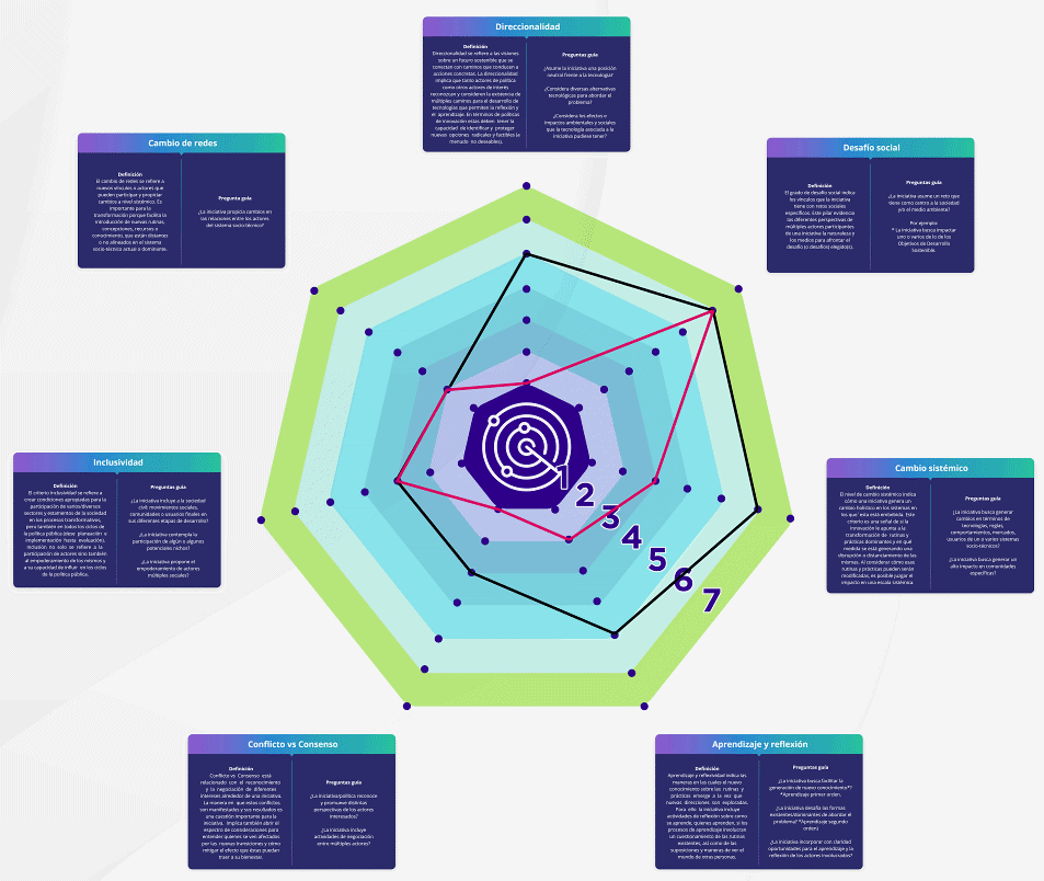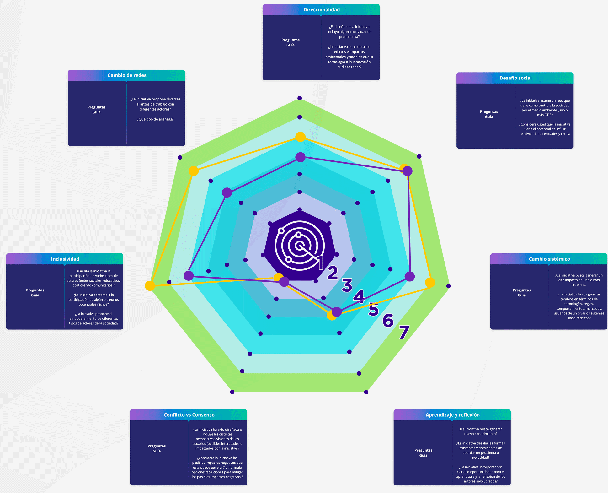 La herramienta Radar: 7 principios de innovación transformativa (Figura 3), elaborada por el HUBLAyCTIP2, fue la elegida para facilitar el diseño de los dos grupos focales, así como el análisis de la iniciativa. Los siete criterios de transformación propuestos por este instrumento se alinean con el enfoque de marco de innovación 3 (Schot y Steinmueller, 2018), que fomenta procesos innovadores dirigidos a resolver los retos ambientales, sociales y económicos de manera sistémica y con una mirada de justicia e inclusión.