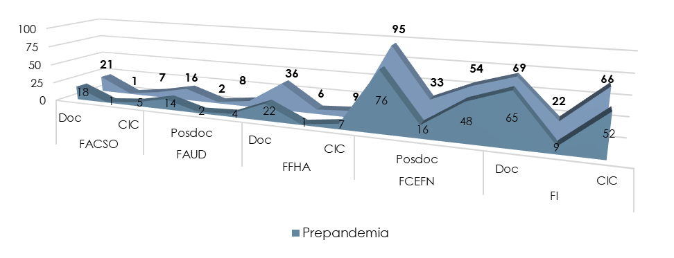 En cuanto a quienes se desempeñan como becarios doctorales, las unidades que más crecieron durante la crisis sanitaria fueron la FFHA y la FCEFN, pasando de veintidós a treinta y seis y de setenta y seis a noventa y cinco, respectivamente. A estas le siguen la FACSO y la FAUD, las cuales crecieron de dieciocho a veintiuno y de catorce a dieciséis. Aun así, la FI se caracteriza por tener el menor incremento, pasando de sesenta y cinco a sesenta y nueve becarios doctorales.
