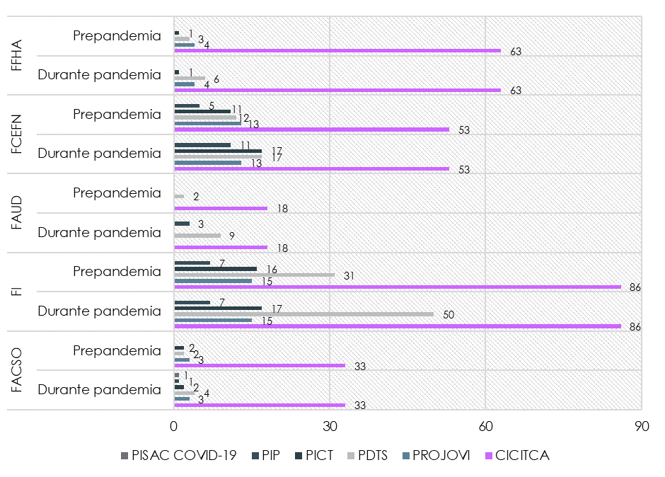 Sumado a esto, durante la crisis sanitaria la FI y la FCEFN monopolizaron los ingresos efectivos de la CIC, manteniendo así su ventaja en comparación con las otras unidades académicas. Por otro lado, si bien la FAUD, la FACSO y la FFHA experimentaron un leve crecimiento en su dotación de investigadores, este avance se consolidó a través de una línea específica de financiamiento del CONICET denominada «Fortalecimiento I+D+i», cuyo propósito general ha sido fortalecer zonas y líneas de vacancia en articulación con casas de estudios nacionales y diversos organismos científico-tecnológicos argentinos.