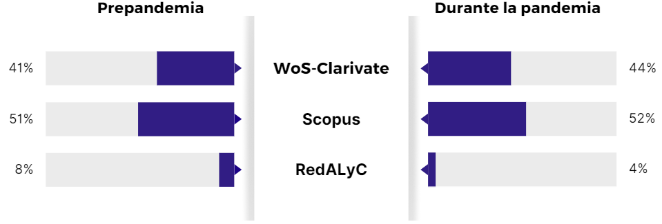 Respecto a las publicaciones científicas, las indagaciones advirtieron un leve cambio en materia idiomática durante la pandemia, evidenciando que investigadores de diferentes disciplinas comenzaron a publicar en castellano con mayor frecuencia. Igualmente, la forma en que se distribuyeron los artículos publicados e indexados en las bases analizadas por disciplina tendieron a fortalecer su polarización. De hecho, las publicaciones científicas registradas en Redalyc, que están significativamente vinculadas a las ciencias sociales, se redujeron en aproximadamente un 50 %, mientras que aquellas relacionadas con las ingenierías, ciencias exactas y naturales sostuvieron sus niveles de prepandemia.