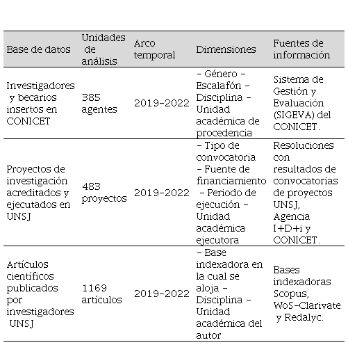 De acuerdo con esto, la arquitectura metodológica se fundamenta en un modelo de investigación interactivo (Maxwell, 2013) que brinda una estructura interconectada y flexible de las distintas fases de la pesquisa, empleando de modo articulado dos accesos empíricos: uno documental y otro estadístico. El primero se ha conformado a partir de un conjunto de documentos públicos e institucionales, como resoluciones y resultados de convocatorias propias del CONICET, la Agencia I+D+i y la UNSJ, cuya lectura analítica se articuló de un modo proactivo con la literatura especializada. Respecto al segundo acceso, fueron diseñadas y sistematizadas tres importantes bases de datos con información acerca de las capacidades institucionales de investigación de la UNSJ. Ellas son presentadas en la Tabla 1: