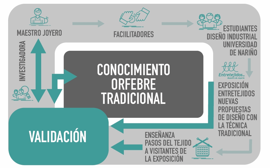 En el contexto de la joyería artesanal en filigrana que se realiza en Pasto, la transmisión de conocimientos de los maestros tradicionales generalmente se limita a su entorno familiar. Por otro lado, el estudiantado del programa de Diseño Industrial de la Universidad de Nariño recibe formación básica en joyería en el octavo semestre del programa curricular. Para algunos egresados, este aprendizaje se ha convertido en un proyecto de vida, generando emprendimientos innovadores que responden a las demandas del mercado, sin embargo, este proceso de formación no ha integrado el conocimiento de los joyeros artesanales, lo que representa una oportunidad en términos de conocimientos culturales y tradicionales.