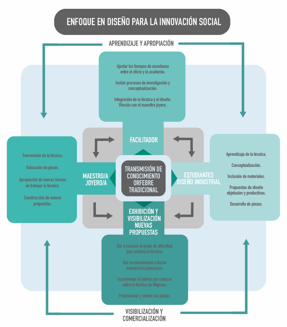 El proyecto se diseñó para facilitar el intercambio intergeneracional de saberes, reconociendo que la joyería artesanal y el diseño son actividades creativas y complementarias. Este proceso integró tres tipos de conocimientos: el saber-hacer tradicional de los maestros artesanos, el conocimiento mixto de diseño y joyería proporcionado por los facilitadores, y el conocimiento académico de estudiantes de Diseño Industrial. Esta integración permitió abordar las necesidades y características de la labor artesanal y académica, ofreciendo un enfoque holístico y participativo desde la innovación social, donde artesanos joyeros y diseñadores industriales en formación proponen nuevas posibilidades para la técnica dentro de un contexto académico. Lo anterior devela un diálogo horizontal, en el cual se produce una amplificación del diseño aunado con los saberes ancestrales (Arango Marín, 2021).