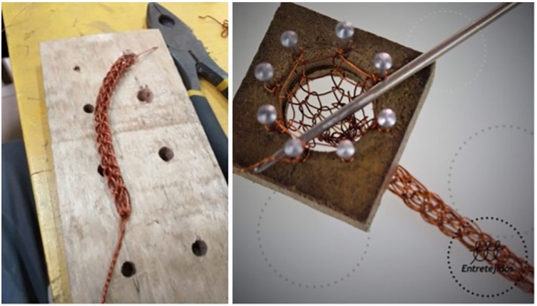 Frente a la situación mundial mencionada, fue necesario conseguir materiales alternativos y contemplar la posibilidad de prescindir de algunos pasos, como la elaboración y soldadura del hilo, además, hacer las adaptaciones necesarias para la transmisión de conocimiento por medios virtuales. Todo esto se consultó con el maestro para no afectar la enseñanza de la técnica; se llegó también a un consenso con el alumnado, que estuvo de acuerdo con aprender esta técnica de manera virtual. El desarrollo de la técnica se convirtió, en ese momento, en una ventaja, ya que se podía prescindir de herramientas específicas del taller y así se logró realizar el trabajo en casa, adaptándose a los tiempos y condiciones de cada estudiante. Los aprendices realizaron investigaciones y propuestas conceptuales que presentaron a los facilitadores, complementando con otras alternativas como hilos tejidos en croché, tejido en guanga y el uso de materiales diversos como alambre, madera, cuentas de collar y chaquiras (ver Figura 7).