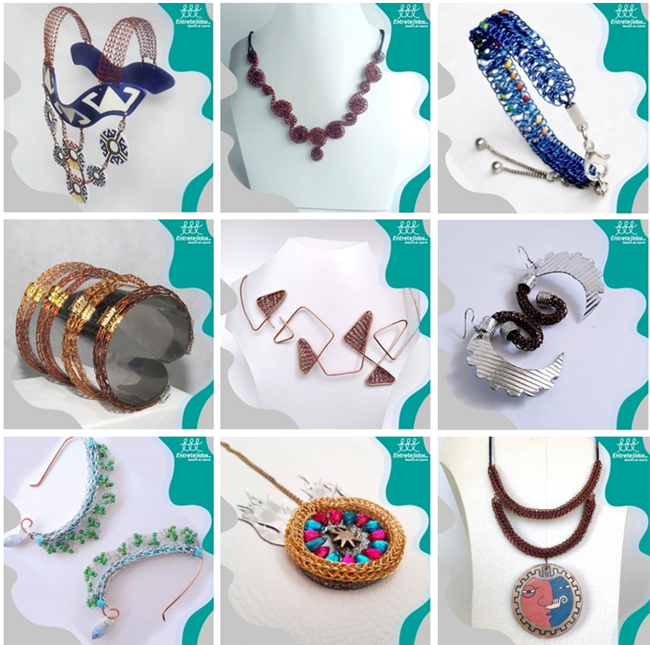 En síntesis, en esta etapa, que ocupó las tres cuartas partes de la totalidad del curso, se realizaron las siguientes actividades: contextualización de la joyería en filigrana; transmisión de conocimiento como enseñanza-aprendizaje de la técnica de cordón tejido con hilo metálico; conceptualización y diseño de joyas aplicando la técnica de filigrana aprendida, producción de cuarenta piezas de joyería (ver Figura 8) y organización de la exhibición, que fue planeada conjuntamente por facilitadores y estudiantes, acordando las piezas que se iban a presentar.