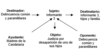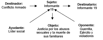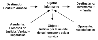 En consecuencia, las narrativas presentadas en este apartado revelan la compleja variedad de experiencias que cada uno de los testigos ha experimentado en el contexto del conflicto armado. La aplicación del modelo actancial de Greimas surge como una herramienta analítica fundamental, que permite la identificación sistemática de cada actor en las respectivas narrativas. Este enfoque destaca de manera precisa los diversos roles y las tensiones presentes en la búsqueda de la justicia, la resistencia y la reconstrucción social, ofreciendo una comprensión más profunda de las complejidades que caracterizan las vivencias de los protagonistas.