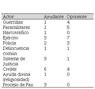 Así, entre los testimonios recibidos se puede observar que los únicos actantes identificados como ayudantes que no actuaron como victimarios, es decir, que aparecen como aliados de quienes compartieron sus relatos, son aquellos que pertenecen a organizaciones civiles, esto es, que no forman parte de grupos armados; entre ellos se encuentran tanto organizaciones de civiles como asociaciones de víctimas o personas que, por la posición que ocupaban o a título personal, pudieron ofrecer apoyo a los sujetos. Pero en el caso de los grupos armados, entre ellos la Policía, el Ejército, los paramilitares, los grupos guerrilleros y la delincuencia común siempre oscilaron entre ayudantes u oponentes, o sea, entre auxiliadores o atacantes, según la perspectiva de cada testigo.
