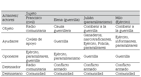 Una lectura de las narrativas basadas en los testimonios de los actores del conflicto armado en Colombia a la luz del modelo actancial de Greimas permite una aproximación sistemática a las lógicas y naturaleza de los roles asumidos e identificados por dichos actores dentro de sus experiencias en el conflicto. Uno de los aspectos más reveladores es el dinamismo que se detecta en el eje de poder identificado por Greimas, en el que confluyen los actantes ayudante-oponente; en este eje, llama la atención el dinamismo con el que los distintos actores identifican el rol de oponente —que en este caso también se puede leer como adversario o enemigo—, considerando que un actor puede ser ayudante y oponente simultáneamente en un mismo relato, o en algunos casos ciertos actores son identificados como ayudantes u oponentes por los demás actores, según las circunstancias de sus experiencias.