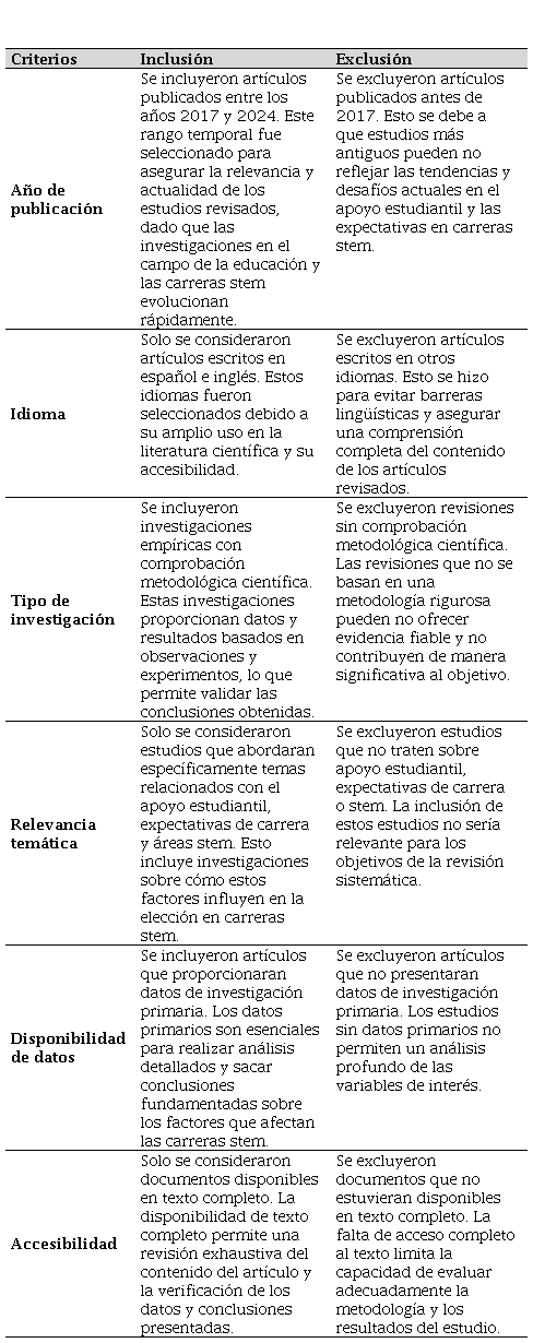 El estudio se llevó a cabo mediante una revisión sistemática, la cual es un tipo de investigación que sigue pasos específicos para encontrar, elegir y evaluar estudios importantes, además de reunir y analizar los datos de las investigaciones seleccionadas (Moher et al., 2009). Las bases de datos utilizadas fueron Dialnet, DOAJ, ERIC, Google Académico, Redalyc, SciELO y Springer. Estos motores de búsqueda, acompañados de tesauros en español e inglés, fueron la base de la búsqueda de artículos relevantes para las intenciones de esta revisión sistemática. Se utilizaron los términos de búsqueda en inglés: peer support, career expectation, stem careers, y en español: «apoyo estudiantil», «expectativas de carrera» y «stem», combinados con operadores booleanos. En la Tabla 1 se abordan con mayor detalle los criterios de inclusión y exclusión utilizados en la búsqueda de información.