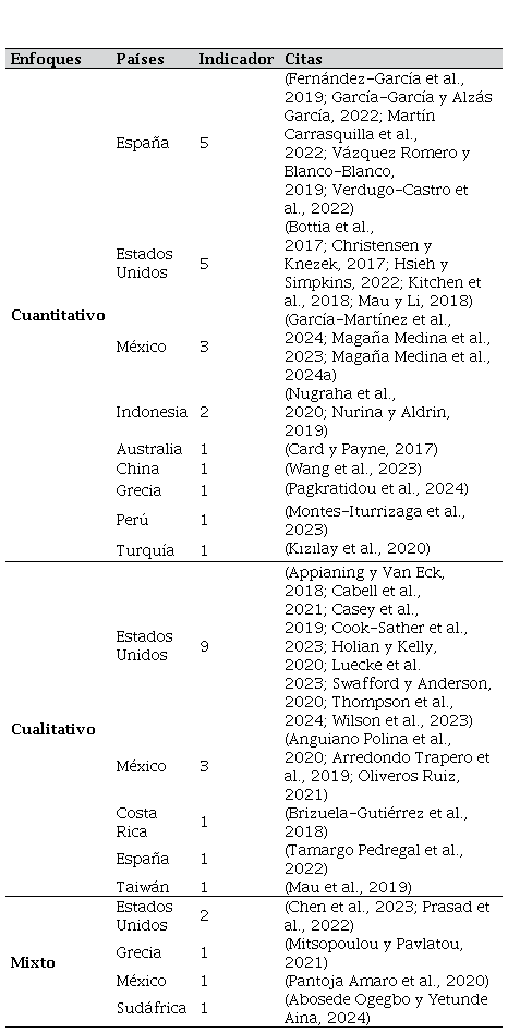 Se puede observar que en México diversos autores (Anguiano Polina et al., 2020; Arredondo Trapero et al., 2019; García-Martínez et al., 2024; Magaña Medina et al., 2023; Magaña Medina et al., 2024a; Oliveros Ruiz, 2021; Pantoja Amaro et al., 2020) han realizado investigaciones de los tres enfoques y se posiciona en segundo lugar detrás de Estados Unidos, de lo que se infiere que se le ha dado la importancia necesaria a investigar esta clase de temas de interés.