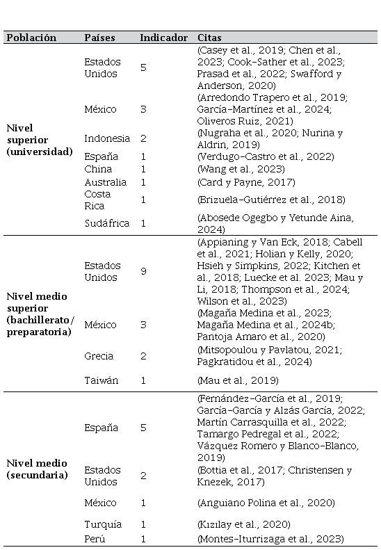 En la Tabla 3 se presenta la población de estudio abarcada en los artículos seleccionados para la revisión sistemática. Aunque esta revisión está enfocada en estudiantes de nivel medio superior, se tomó la decisión de incluir estudios con población de nivel superior, ya que las temáticas y variables identificadas son de interés para el estudio. Los rangos de edades de las poblaciones estudiadas quedaron de la siguiente manera: de 12 a 15 años, en el nivel medio; 15 a 18 años, en el nivel medio superior; y en el nivel superior, de 18 años o más.