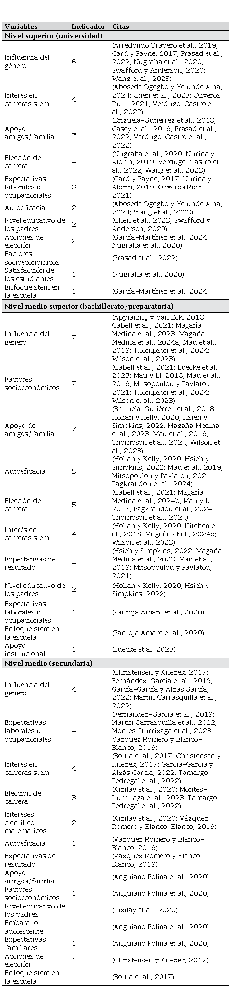 Los resultados de esta revisión sistemática revelan que la elección de carreras stem entre estudiantes de nivel medio superior está influenciada por una combinación de factores sociales, económicos y psicológicos, en la que las expectativas de carrera y el apoyo estudiantil desempeñan roles fundamentales; sin embargo, no son los únicos factores importantes. Para fines de este estudio, los porcentajes mencionados a continuación corresponden únicamente a las variables identificadas en investigaciones que se centran en estudiantes de nivel medio superior.