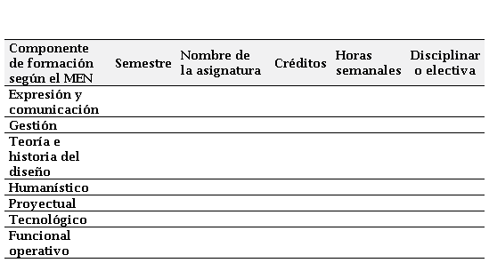 Se elaboraron cuadros de correlación en hoja electrónica Excel con elementos de comparación constantes para todos los programas analizados (ver Tabla 1), con el objetivo de establecer un paralelo entre las áreas de formación y las condiciones de calidad establecidas en la Resolución 3463 del Ministerio de Educación Nacional (men, 2003). Entre estas condiciones se incluyen los componentes de formación propios de la disciplina: componente de expresión y comunicación, componente de gestión, componente de la teoría e historia del diseño, componente humanístico, componente proyectual, componente tecnológico y componente funcional–operativo.