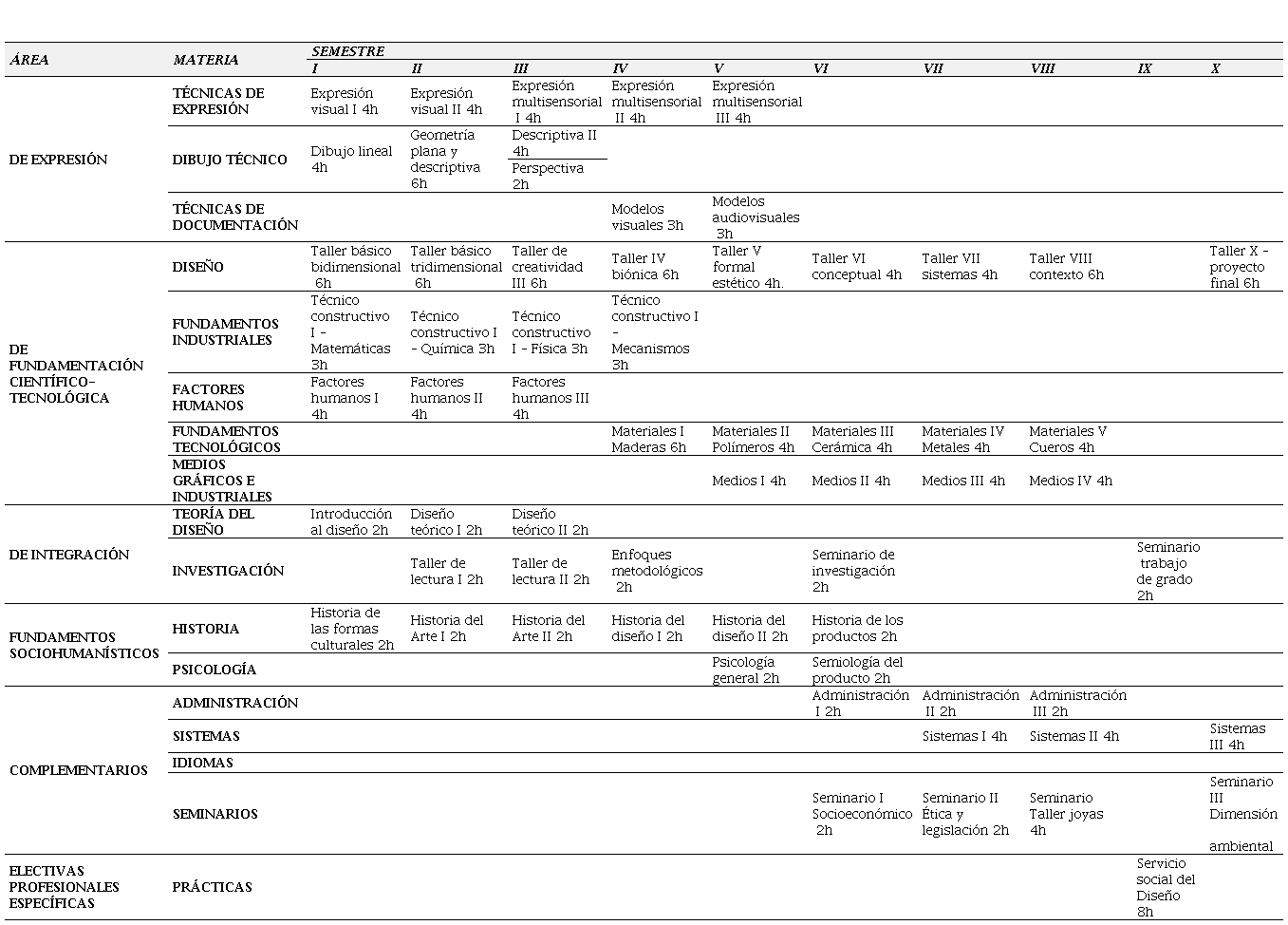 A cada área de formación le correspondía un grupo de asignaturas que se desarrollaban de manera lineal en los semestres correspondientes, configurándose así el esquema presentado en la Tabla 2.
