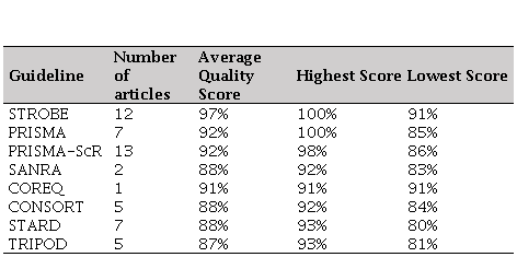 The oldest study included was published in 2018, and the most recent in 2024. A total of 51 studies were sourced from PubMed and one from ScienceDirect. Table 1 presents the methodological guidelines used for evaluating each type of article, along with the average quality score and the highest and lowest ratings for each guideline.