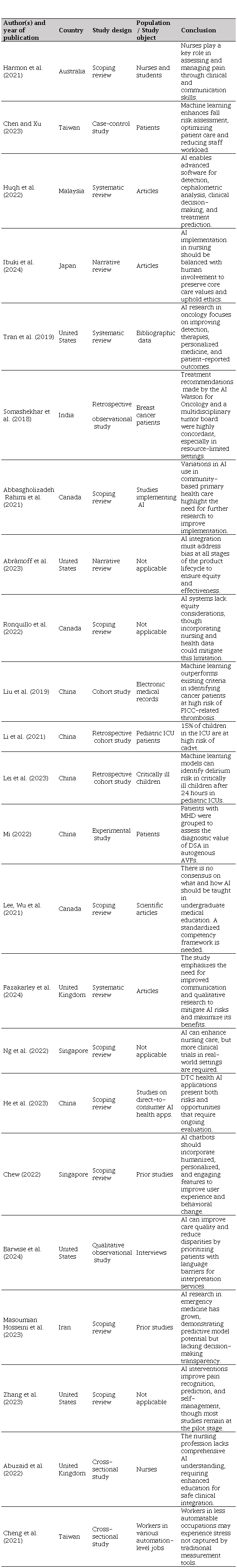 The evidence indicates that AI is not without risks, which calls for a prudent and reflective approach to its applications in nursing. An Aristotelian perspective may be useful in finding a balanced position regarding the use of these technologies in healthcare. Issues such as inequality—particularly notable in the scarcity of studies from several Latin American countries, reflecting disparities in AI access—and automation hold special significance in already inequitable geopolitical contexts with major social challenges. The risks associated with technological dependence and the dehumanization of care require in-depth analysis, especially since humans have become “techno-persons” (Fazakarley et al., 2024; Huqh et al., 2022; Lee, Wu et al., 2021; Mi, 2022). Thus, care in the 21st century cannot be conceived devoid of technology.