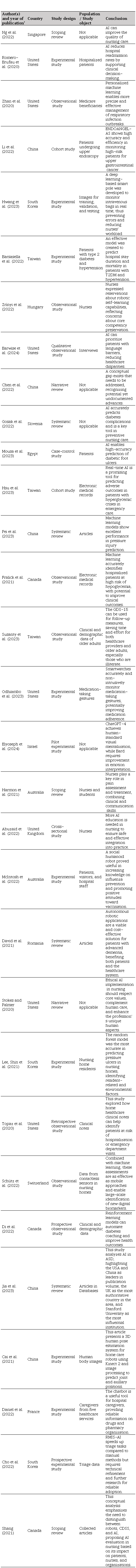 Nonetheless, the results of this review also highlight the opportunities AI offers to transform nursing care. The automation of routine tasks, such as clinical monitoring and administrative management, can free up time for professionals to focus on activities that require essential human qualities (Noorbakhsh-Sabet et al., 2019). Additionally, AI’s predictive capabilities have proven valuable for anticipating complications and personalizing interventions, thereby improving clinical outcomes and enhancing the overall quality of care (Ng et al., 2022; Gosak et al., 2022).