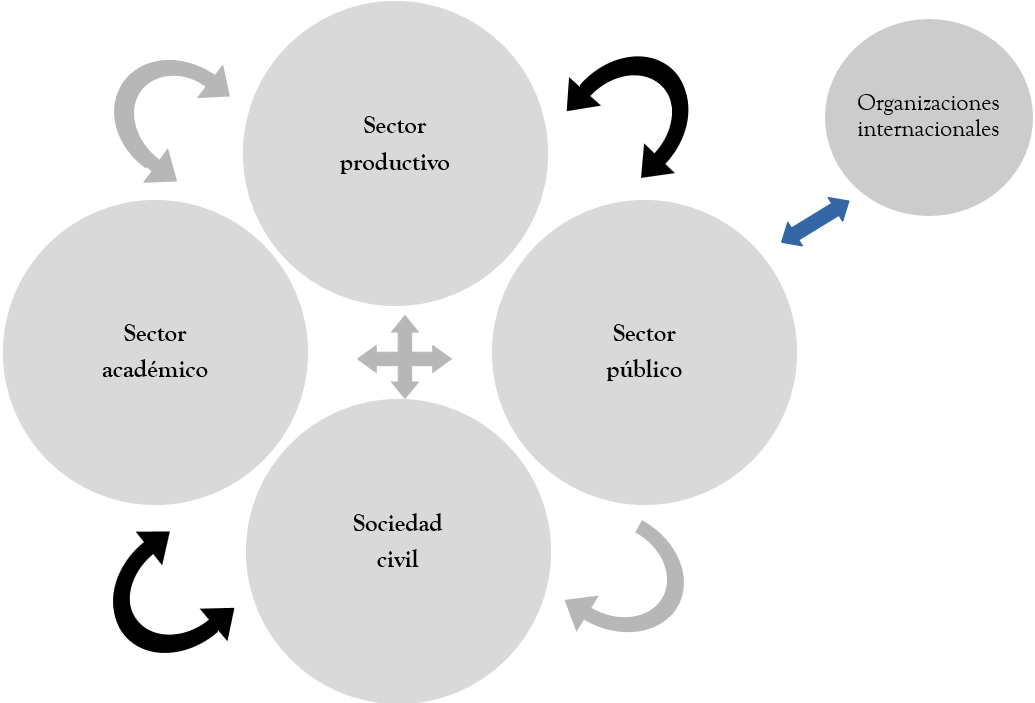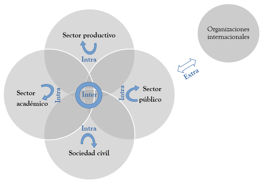 Nota. Cada círculo representa un sector. En las intersecciones se dan las interacciones entre los actores del mismo sector (intrarrelaciones), de diferentes sectores (interrelaciones) y entre actores nacionales y del exterior (extrarrelaciones).