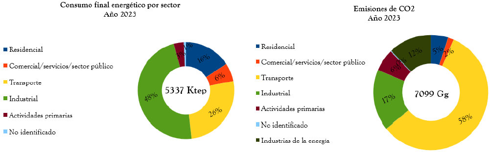 Dicha transformación sucedió en el marco de una política de Estado en materia energética que dio respuesta a las carencias estructurales del sector (MIEM, s.f.). La misma fue desarrollada y aprobada por el Poder Ejecutivo en 2008 y avalada en el año 2010 por una comisión interpartidaria (Ardanche et al., 2017, 2018). Sin embargo, quedan subsectores dependientes de los combustibles fósiles, como el transporte, responsable del 58 % de las emisiones de carbono en 2023 (Figura 2).