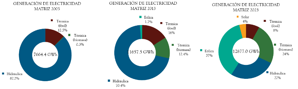 Uruguay carece de reservas fósiles, pero cuenta con fuentes de energía primaria renovables. La hidroelectricidad se incorporó en la primera mitad del siglo xx, y hasta los años 2000 se utilizó la energía generada a partir del agua y los recursos fósiles importados. Más recientemente se incorporaron las energías eólica, biomasa y solar para la generación eléctrica (Contreras et al., 2024). Eso permitió que en pocos años el Uruguay se encuentre entre los pioneros en energías renovables, destacándose la energía eólica (Figura 1).