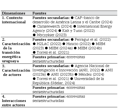 El diseño metodológico utilizado para alcanzar el objetivo propuesto fue de tipo cualitativo y centrado en un estudio de caso exploratorio (Yin, 2018). El trabajo se estructuró en cuatro dimensiones: 1. Caracterización del contexto internacional. 2. Caracterización de la transición energética uruguaya. 3. Caracterización de los actores involucrados. 4. Interacciones entre los actores.