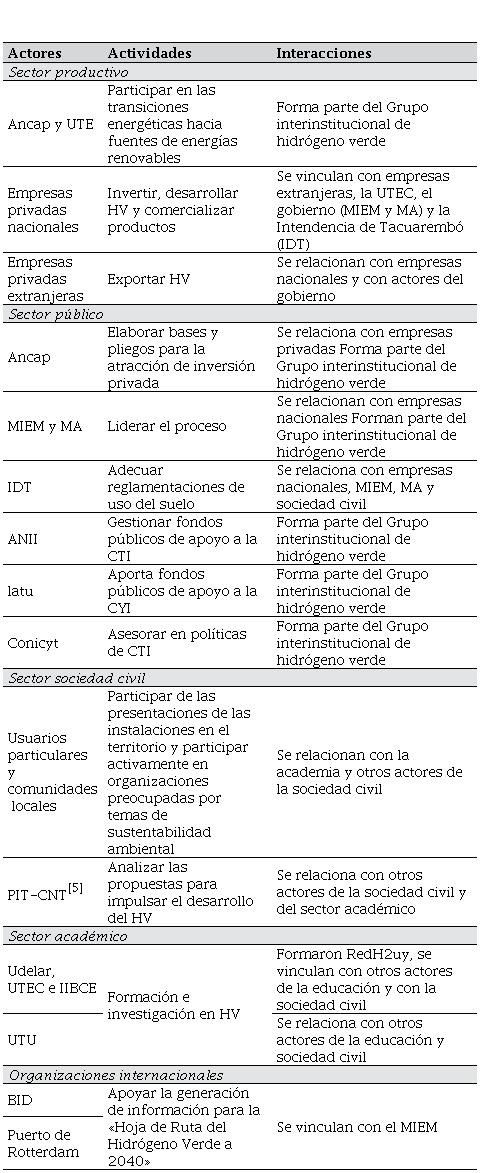 La introducción del HV a la matriz energética uruguaya puede entenderse desde el enfoque de los sni, como un proceso social e interactivo en el que participan varios actores. Resulta clave analizar a los actores involucrados y, especialmente, describir sus relaciones. Los vínculos sistémicos y virtuosos entre los actores pueden generar espacios de interacción entre el aparato científico-tecnológico, el gobierno y el sector productivo, favoreciendo la generación de nuevo conocimiento, procesos de aprendizaje, visibilidad de problemas productivos y de la sociedad civil, entre otros.