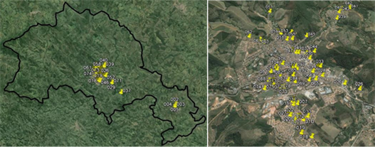 Foram realizadas 107 entrevistas com proprietários de negócios que operavam na informalidade. Para se encontrar tais negócios e seus respectivos proprietários, todas as ruas da zona urbana do município de Machado foram percorridas, de modo que a cada negócio que era identificado, solicitava-se ao seu proprietário a permissão para a realização da entrevista. Após a entrevista, solicitava-se ao proprietário entrevistado a indicação do próximo negócio a ser identificado. Três proprietários identificados não quiseram participar da pesquisa e por isso sua localização não foi registrada. A localização geográfica dentro do município de Machado, dos negócios cujos proprietários foram entrevistados, é apresentada na Figura 1, onde se fez uma aproximação da região com maior concentração de respondentes, para melhor visualização.