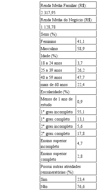 Com relação à caracterização socioeconômica dos proprietários dos negócios, os resultados são apresentados na Tabela 1. Quando se analisa a renda média familiar, tem-se o valor de R$ 2.317,95, sendo composto tanto pelo rendimento oriundo do negócio quanto da renda auferida pelo cônjuge ou, ainda, por outra renda qualquer como a aposentadoria do proprietário. Quando se analisa somente a renda média oriunda do negócio, a média encontrada foi de R$ 1.128,78, média esta superior ao salário mínimo vigente de R$ 724,00. Esse fato confirma o defendido por alguns autores como Cacciamali (1994), Becker (2004), Maloney (2004) e Paschoal et al. (2013) de que aqueles indivíduos ocupados em atividades incluídas na economia informal nem sempre auferem renda inferior aos rendimentos dos trabalhadores assalariados.