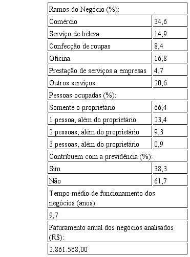 Os negócios, em sua maioria, pertencem ao ramo de prestação de serviços e são negócios “maduros”, “consolidados”, deixando claro a necessidade por políticas públicas que venham a inserir esses negócios na economia formal, de maneira a subsidiar seu crescimento. Ainda, constatou-se que a maioria dos proprietários trabalha sozinha ou com mão de obra familiar, o que descaracteriza a relação típica de assalariamento, não havendo uma separação nítida entre capital e trabalho. Com relação ao faturamento, a parcela do PIB do município movimentado na informalidade ficou bem abaixo do exposto em outros trabalhos, chegando a 2,7%.