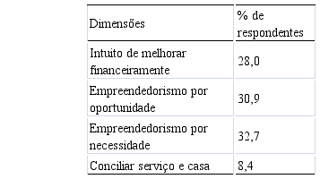 Um dado que chama a atenção é que 8,4% dos respondentes que se enquadraram na dimensão “conciliar serviço e casa” eram todas mulheres, ressaltando a necessidade da mulher moderna de conciliar sua dupla jornada, sendo responsável tanto por compor a renda da família como também pelos serviços do próprio lar. Especificamente em relação à dimensão “Intuito de melhorar financeiramente”, cabe destacar que os respondentes, de maneira geral, tinham acesso ao emprego formal e abriram mão dessa ocupação por uma oportunidade de maiores ganhos, operando seu negócio próprio, mesmo que na informalidade. Essa situação se difere de uma situação de empreendedorismo por necessidade onde o indivíduo, ao não ter acesso ao emprego formal ou a qualquer fonte de renda, se vê forçado a trabalhar por conta própria em um negócio informal.