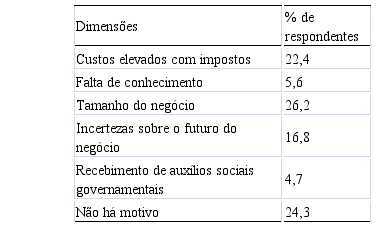 Na segunda pergunta, a respeito das razões que levam os proprietários a não formalizarem os seus negócios, as seguintes dimensões foram identificadas: “custos elevados com impostos”, “falta de conhecimento”, “tamanho do negócio”, “incertezas sobre o futuro do negócio”, “recebimento de auxílios sociais governamentais” e “não há motivo”. Os resultados são apresentados na Tabela 4.