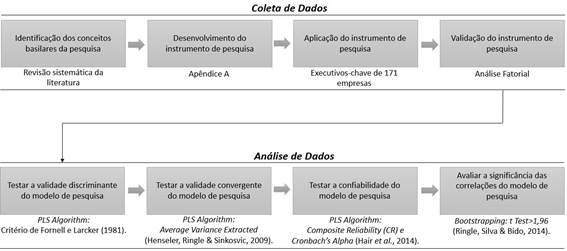 Este estudo se caracteriza como exploratório e descritivo de corte transversal-único, com abordagem quantitativa, em virtude das técnicas de coleta e análise de dados utilizadas, realizada por meio de um survey, em virtude de ser a abordagem mais adequada ao propósito e estratégia da pesquisa (Malhotra, 2014). A Figura 1 – desenho da pesquisa apresenta as principais etapas do protocolo de pesquisa.