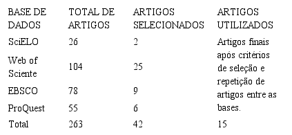 A revisão das principais bibliografias que conduziram a proposição desta pesquisa foi realizada por meio de levantamento no acervo nas principais bases de dados da área em publicações científicas (Tabela 1). Nesse sentido, o presente estudo obteve o total de 263 artigos como resultados das buscas. Destes, foram selecionados 42 na primeira etapa, e excluídos 27, por não apresentarem foco na PO vista como “gestão nas empresas”, ou seja, apresentavam outros resultados sobre a temática. Sendo assim, alinhando-se ao objetivo deste trabalho, analisou-se um total de 15 artigos que foram utilizados para indicar as variáveis analisadas neste estudo presentes no Apêndice A.