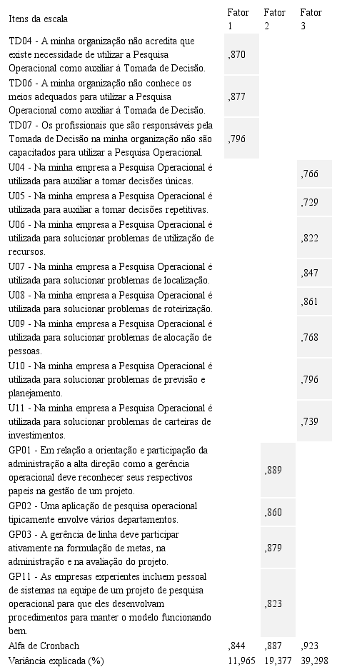 Diante desses resultados, utilizou-se a agregação dos scores dos itens para a formação dos três fatores (construtos) que foram utilizados na segunda fase multivariada. Para esta pesquisa, o Fator 1 recebeu o nome de “tomada de decisão”, o Fator 2 de “gestão de projetos” e o Fator 3 de “expectativa de uso”. Ao analisar os fatores individualmente, é possível perceber características específicas associadas às variáveis que foram agrupadas. No caso do “Fator: tomada de decisão (1)”, fizeram correspondência respectivamente: TD04 (necessidade), TD06 (conhecimento) e TD07 (capacitação); no “Fator: uso (2)”, fizeram correspondência respectivamente: U04 (decisões únicas), U05 (decisões recorrentes), U06 (alocação de recursos), U07 (problemas de localização), U08 (problemas de roteirização), U09 (alocação de pessoas), U10 (previsão e planejamento) e U11 (carteiras de investimento); e no “Fator: gestão de projetos”, fizeram correspondência: GP01 (participação da alta gerência), GP02 (departamentalização), GP03 (participação da gerência de linha) e GP11 (envolvimento do time de TI).