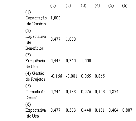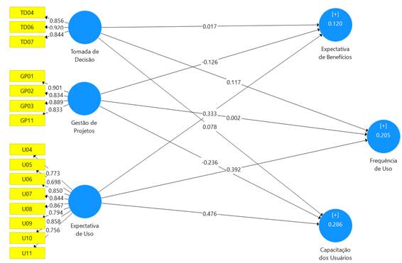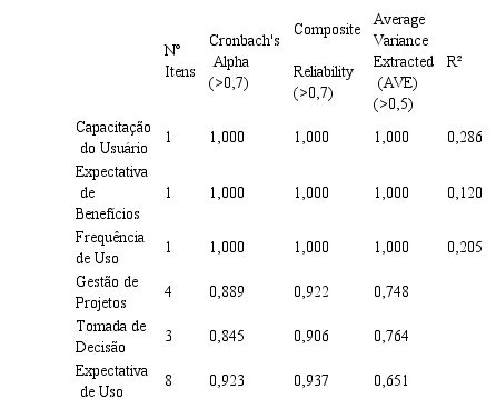 Este estudo foi norteado por uma abordagem quantitativa, que mediu conjuntamente variáveis latentes de primeira ordem identificadas na AFE, agrupadas em três variáveis de segunda ordem: “tomada de decisão”, “gestão de projetos” e “uso”. As variáveis dependentes do modelo são três: “capacitação do usuário”, “expectativa de benefícios” e “frequência de uso”. Elas foram estimadas por um item em escala de Likert variando de 0 a 7, sendo que as demais variáveis para a construção do modelo foram medidas na mesma escala, mas de 0 a 5.