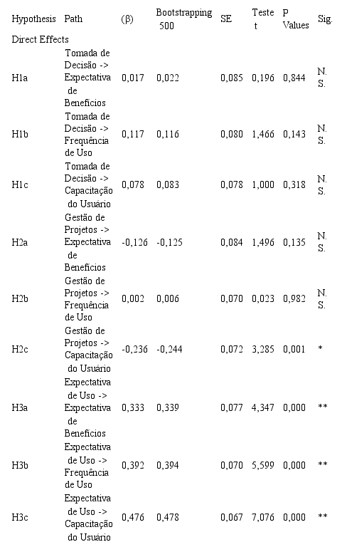 Já as hipóteses que evidenciam o uso da PO se mostraram bastante significantes (p<0,001) e todas se relacionaram positivamente com os construtos. No caso, a terceira hipótese demonstra que, com o uso da PO, a expectativa de benefícios dessa utilização tende a crescer. Com a não rejeição da hipótese H3b, percebe-se que a frequência de utilização e reconhecimento da PO também cresce conforme seu uso. Ainda, com a hipótese H3c, verifica-se que a capacitação dos usuários tende a aumentar quando existe o seu uso nas organizações.
