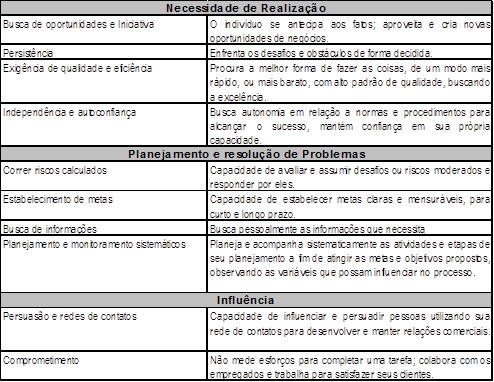 McClelland (1972) fundamentou sua teoria na motivação psicológica, baseada nas necessidades de realização, de afiliação e de poder, propondo as dez características do comportamento empreendedor, conforme Quadro 1.