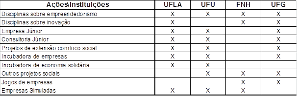 As ações direcionadas à educação empreendedora praticadas pelas IES pesquisadas identificadas na pesquisa foram: Disciplinas sobre empreendedorismo; Disciplinas sobre inovação; Empresa Júnior; Consultoria Júnior; Projetos de extensão com foco social; Incubadora de empresas; Incubadora de economia solidária; Outros projetos sociais; Jogos de empresas e Empresas Simuladas, como mostra a Tabela 1.