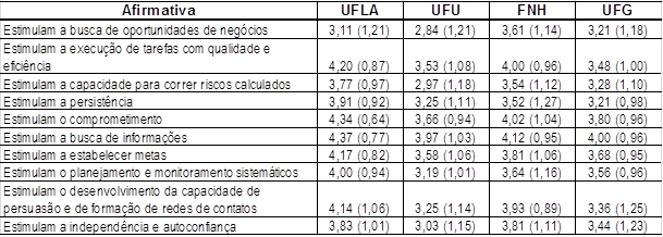 Em relação à segunda parte do questionário, que compreende a Escala Likert, as afirmativas foram agrupadas pelos temas propostos. As dez primeiras afirmativas estão relacionadas Características Comportamentais do Empreendedor segundo McClelland (1972). A Tab. 2 apresenta a média e o desvio padrão para estas afirmativas. A partir dos dados, observa-se que os alunos têm uma percepção positiva em relação ao estímulo provocado pelas ações desenvolvidas pelas IES para o desenvolvimento do empreendedorismo. As maiores médias alcançadas foram obtidas pela UFLA e FNH. As características que mais se destacam são o estímulo ao comprometimento e a busca de informações. Essas afirmativas geraram percentuais de frequências absolutas de até 94% de respondentes que concordam que tais ações estimulam o desenvolvimento destas características.