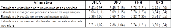 Sobre a dimensão da inovação, a FNH apresentou as maiores médias segundo a percepção dos alunos, como se pode observar na Tab. 3. Estes resultados refletem a presença de um Projeto Pedagógico que propicia tais estímulos por meio das disciplinas ofertadas relacionadas ao tema, jogos de empresas, empresas simuladas e demais projetos sociais, uma vez que trata-se de uma Instituição relativamente nova, que ainda não possui atividades como as incubadoras, como no caso das IES públicas pesquisadas.
