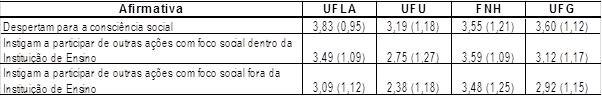 Para as afirmativas relacionadas ao conceito de Inovação Social de Fischer e Melo (2006), os dados (Tab. 4) mostram uma percepção positiva por parte dos alunos da FNH e da UFLA em relação aos estímulos fornecidos pelas ações das IES. A UFG e a UFU obtiveram boas médias para a variável “despertam para a consciência social”, apesar disso, obtiveram médias menores nas demais variáveis. Os dados sugerem que os estímulos ainda possam ser insuficientes para realmente desenvolver o empreendedorismo e a inovação social. Isso pode estar ligado ao fato de ainda haver uma cultura no país que relaciona esse campo somente ao Terceiro Setor e ao trabalho voluntário. Este conceito ainda se apresenta um pouco nebuloso para docentes, discentes e para a sociedade em geral, o que torna necessário um esclarecimento sobre o tema nas IES, para que esta cultura possa ir se alterando e, com isso, abrindo novas possibilidades tanto para estes alunos, quanto para a sociedade como um todo. Além disso, nestas questões houve um percentual maior de alunos que marcaram a opção “sem opinião”, o que trouxe as médias destas afirmativas para baixo.