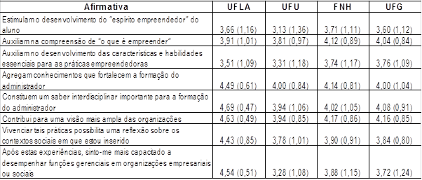 A tabela 5 apresenta as médias obtidas para as percepções dos alunos em relação às ações promovidas pelas IES para desenvolver o empreendedorismo e a inovação social. Os dados apontam que os alunos, de um modo geral, tem boas percepções com relação a tais ações, o que demonstra que eles percebem a importância delas para a formação do Administrador. Nesta dimensão, destacam-se as médias da UFLA e da FNH, que apresentaram as médias mais altas e com variabilidade relativamente baixa dos dados. Dentre as afirmativas, as que receberam maior destaque em todas as IES pesquisadas foram: “agregam conhecimentos que fortalecem a formação do administrador”; “constituem um saber interdisciplinar importante para a formação do administrador”; “contribui para uma visão mais ampla das organizações”; “possibilita uma reflexão sobre os contextos sociais em que estou inserido”; e “capacita a desempenhar funções gerenciais em organizações empresariais ou sociais”.