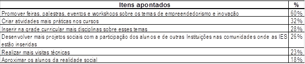 Na terceira parte do questionário, dedicada a solicitar a opinião dos alunos respondentes sobre quais as ações eles consideram que deveriam ser desenvolvidas pelas suas respectivas IES para promover o empreendedorismo, a inovação empresarial e a inovação social, foram encontradas várias sugestões, dentre elas, as que mais destacaram foram: