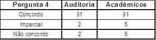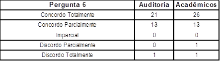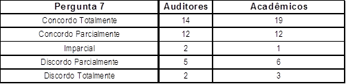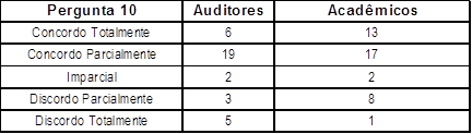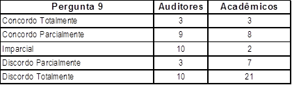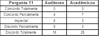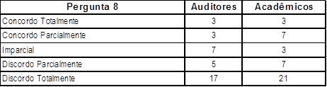 A maioria dos entrevistados discordou totalmente da prática. Quando os grupos são observados individualmente, os acadêmicos continuam, em sua maioria, a discordar totalmente da administração da empresa, enquanto os auditores se dividem entre as respostas.