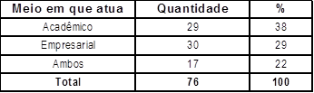 A pergunta seguinte tem como propósito identificar o meio em que cada participante atua, com a intenção de se conhecer se há visão prática, vivenciada no meio empresarial, e se há visão teórica, percebida pelos acadêmicos. O Quadro 2, a seguir, destaca a segregação dos respondentes de acordo com o meio em que atuam, apresentando uma amostra equilibrada já que a quantidade de professores e auditores é similar.
