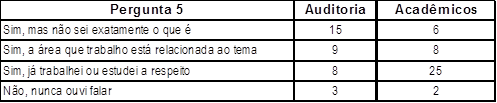 A quinta pergunta (Quadro 5) investigou se o respondente já havia ouvido falar sobre contabilidade criativa.