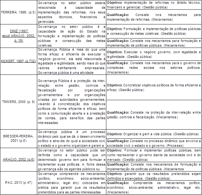 Desvelando inicialmente do conceito de Governança Pública, o estudo da teoria disponível, permite a explicitação de conceitos e características de governança pública, desenvolvidos por diferentes autores e apresentada na Figura 1.