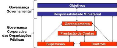 Em síntese, na parte superior da Figura 2, verifica-se que a responsabilidade governamental em cumprimento aos objetivos políticos e sociais, direciona as ações estratégicas das organizações para estabelecer outro nível de governança a Governança Corporativa das Organizações Públicas. Esta última refere-se mais a dimensões técnicas de gestão e organização dos fatores de produção colocados a disposição dos Administradores públicos.