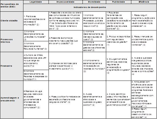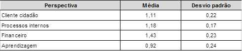 Para a análise de como os princípios se materializam nas práticas gerenciais dentro das 4 (quatro) perspectivas do BSC: (1 Cliente Cidadão, 2) Processos internos, 3) Financeira e 4) Aprendizagem) seguiu-se analogamente a escala usada para determinar a média dos fatores LIMPE. Defende-se que o diagnóstico realizado por estas perspectivas, torna a análise transversal a medida que engloba todos os fatores do LIMPE associados a cada uma das perspectivas do BSC, o que permite uma identificação de desempenho mais relacionada a visão estratégica da gestão e a real satisfação das necessidades do cidadão, que não restringe suas necessidades a uma categoria específica, mas sim a transversalidade delas.