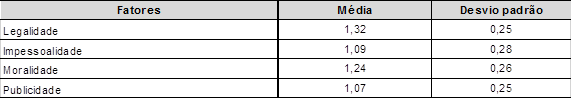 Observa-se que o fator que obteve maior média foi o princípio da legalidade com 1,32 de média e desvio padrão 0,25. É necessário expor que as ações vinculadas a este princípio em sua maioria não são discricionárias, são vinculadas, ou seja, o gestor deve executá-las por determinação legal sob pena de responsabilização na sua gestão. Desta forma, a vinculação a lei das ações de gestão necessárias ao cumprimento dos princípios pode explicar o fato de ser a maior média encontrada e o fator mais próximo do ponto 2 (dois) categorizado como ideal.